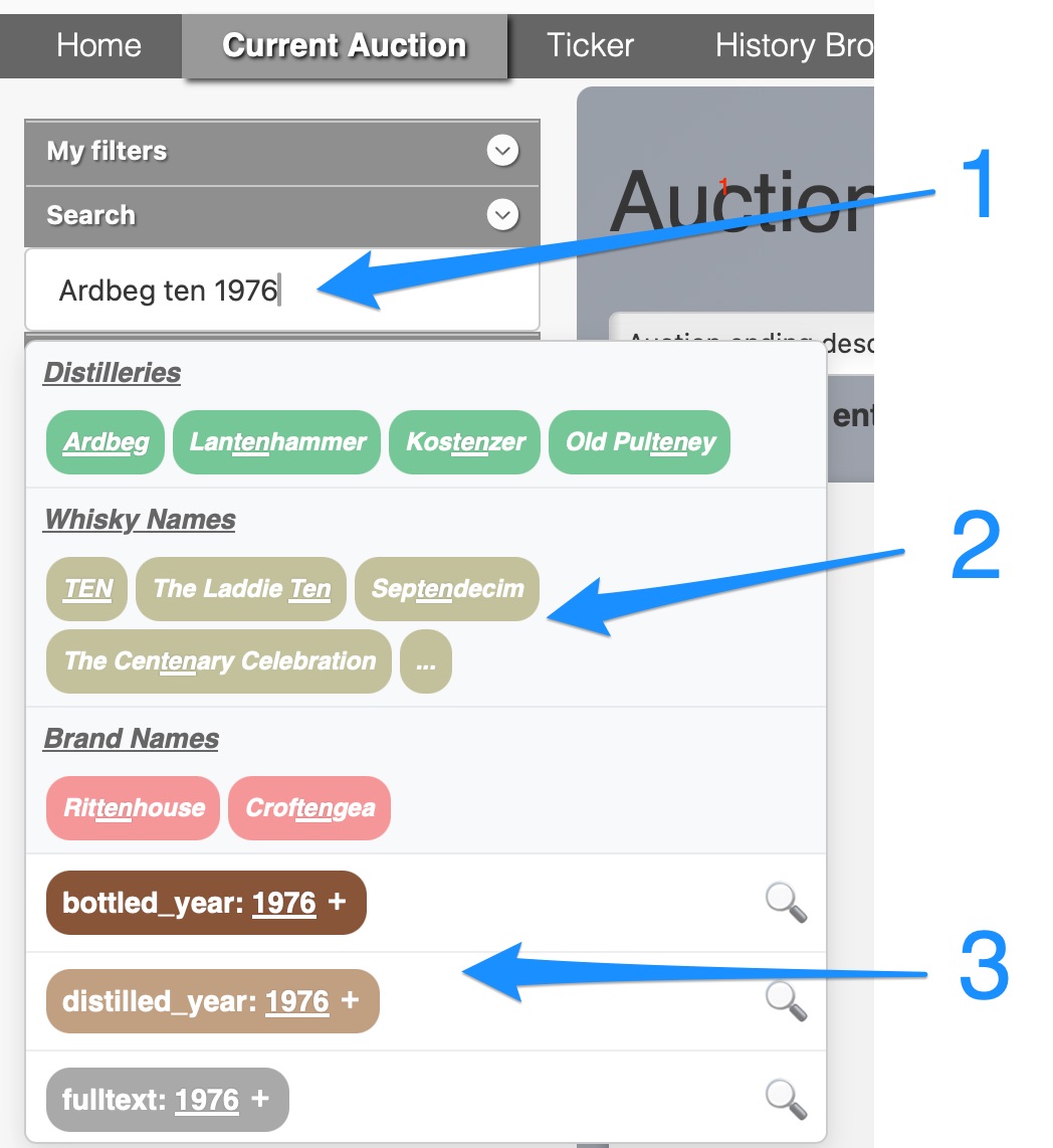 Please note, that the search suggestion field will only present suggestions that you could have selected in the existing filters at the moment in time. If you search for "Ardbeg 1976" in a fresh search, you will see Ardbeg as a distillery and "1976" as bottled or distilled year options. This does NOT mean, that there must be an ardbeg from either distilled or bottled year 1976 in the current auction. After clicking on Ardbeg, the available suggestion may therefore no longer show bottled or distilled year 1976 as a valid option.
